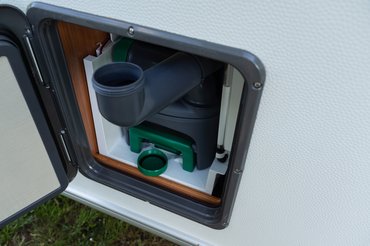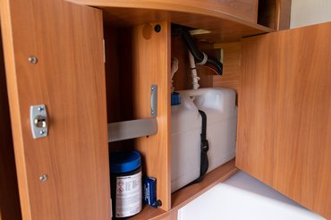 A vízrendszer külön tisztavíz-tartályos volt, vagyis a mosogató és a mosdó is saját 12 literes kannát kapott, a csapba beépített, külön mikrokapcsolós szivattyúval. A szürkevíz-tartály ennél a verziónál nincs az alvázra rögzítve, külön kell oda telepíteni a lakó alá. Bár a mosdóban van összefolyó, ennek ellenére zuhany nincs a lakóban, de ez egy kempingben nem akkora gond. A wc is külön tartályos volt, kicsit trükkös töltéssel. A kifordított betöltő nyílásba túl kell tölteni a vizet, hogy a belső peremen átbukva belecsorogjon a tartályba. A vízszintet egy egyszerű üvegcsövön figyelhetjük a szerelőajtónál.