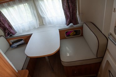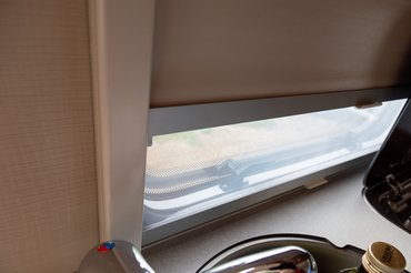 A beltér gyakorlatilag az én Novám kicsinyített változata. Az elejében egy kétszemélyes asztal, pad kombóval indít, amit pár mozdulattal egyszemélyes ággyá alakíthatunk. Ebből nagyon jó kilátás van az ajtón és az első ablakokon keresztül, miközben heverészve olvasgatunk, dolgozunk. Az első ablakok két részletben nyílnak és alattuk praktikus polcot találunk. Az összes ablakon szúnyogháló/hővédő fólia kombó van, így fura is volt, hogy a bejárati ajtóra nem jutott egy elhúzható szúnyogháló.