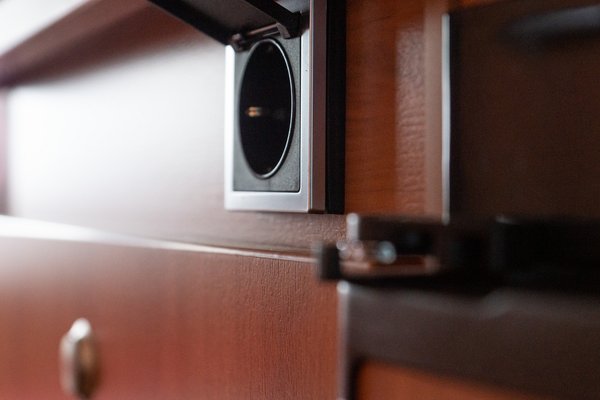A maradék helyen alul a fűtés van, ami egy sima kisméretű konvektor a Trumátol, mögötte a kábelek és csövek tengerével. Felette egy akasztós szekrény, alul az elektromos kapcsolókkal, miegymással. Konnektorból hármat találtam, egész fura helyekre elhelyezve. Egy a főzőpul széle alatt, ez nálam a felette lévő polc alján van, és ott talán kicsit praktikusabb lenne. A másik az első ablak polcán, ezzel nincs is semmi gond. A harmadik viszont egész fura módon a gardrób tetejére került, amivel csak az a gond, ha lecsukjuk a tetőt, nem árt emlékezni mit hagytunk ott, mert azt csak nyitás után fogjuk kiszedni onnan. A másik, amire vigyázni kell zárás előtt, a magasabb tárgyak ugyanitt, érthető okokból.