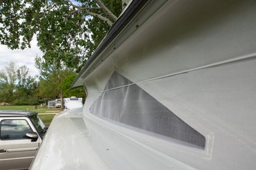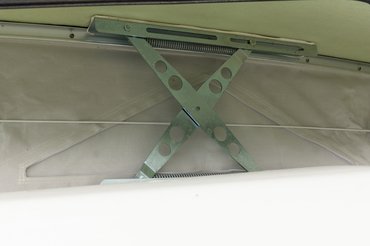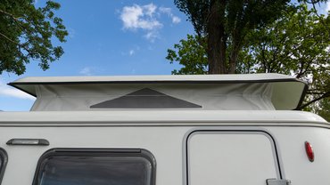 A beltér finoman szólva is kompakt. A magasságproblémát úgy hidalták át, hogy a tető közepe könnyedén felemelhető (ekkor 195 cm magas lesz), és a felső részen körben sátorponyva véd az elemektől, cserébe fel tudtam egyenesedni. Három oldalán szellőzők, természetesen szúnyoghálóval, így egész jól át lehetett szellőztetni a lakókocsit.