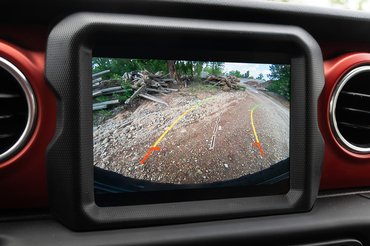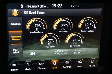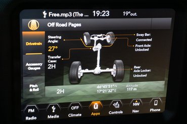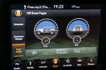 A másik két panelből az egyik a terepjárókban szokásos dőlésszögmérő, a másik pedig arról tudósít, mi a helyzet a kocsi alatt. A képen az látható, hogy a kormány balra van fordítva 27 fokban, a terepváltó pedig 2H állásban van, vagyis a hátsó kerekeket hajtja a motor. Részben emiatt is külön kapcsolható a hátsó tengely differenciálzárja, hiszen van helyzet, amikor ez is elég a továbbjutáshoz.