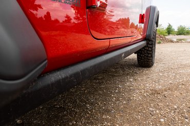 A másik furcsaság a kulcslyuk. Hiszen amúgy a konkrét modell keyless rendszerű volt, és már megszoktuk, hogy nem látunk sehol konkrét kulcsnyílást. A beszállást itt nem segíti nadrágkoszoló fellépő, de sáros időben itt se árt vigyázni. A kocsi oldalán fellépő helyett egy acél küszöbvédő fut végig, ami így nem rontja a kocsi terepképességeit, mégis védi a hosszú tengelytáv miatt sérülékeny küszöböt.