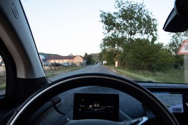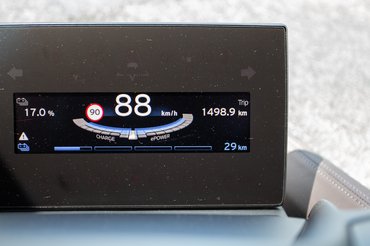 Megpróbálok egy visszafogottabb tempót, beállok 100-110-re, egyre neccesebb, hogy odaérek a kétórás kezdésre a ZalaZone-ba. Az első ötven kilométer alatt megeszik húsz százalékot a töltésből, de mindjárt vége az autópályának, jöhet végre a rekuperálgatás, a neki való tempó; dolgozhat az algoritmus, hogy a változó terepből kiszámolja, van-e esélyem odaérni. Pálya vége: úgy megyek tíz kilométert, hogy csak egyet fogy a hatótáv, viszont idáig már megértettem, hogy a százalék a mérvadó. Megint folyamatos a fejben matek, hogy oké, hogy ha így fogy tovább a kilométer (tuti nem így fog) akár még ki is adhatja, de Zalaegerszeg előtt mintha dombos lenne a táj.