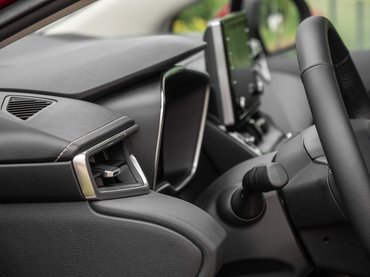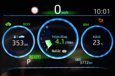 Az LCD mellet két oldalt maradtak a hagyományos mutatós műszerek. Jobbra benzinszint, és vízhőfok, balra pedig fordulatszámmérő. Itt bicsaklott meg először bennem valami. Mit keres egy hibridben fordulatszámmérő? Ráadásul ez még a gyengébbik, egynyolcas, 122 lóerős változat, szóval azt sem lehet rámondani, hogy a sportosság kedvéért volt szükség a gázállástól függően hol itt, hol ott letáborozó mutatóra. Egy ilyen hibrid rendszerben egyszerűen nincs érdemi funkciója. Sokkal hasznosabb lett volna a már megszokott hibrid-mutató, ami alapján látni, hogyan érdemes a fékezéssel visszatermelni, vagy épp gyorsítani.