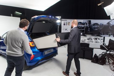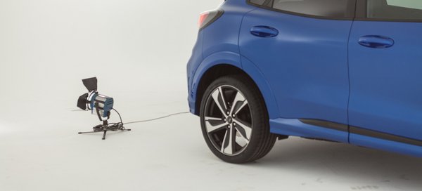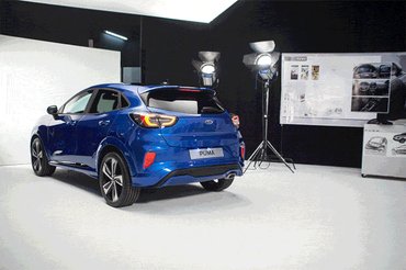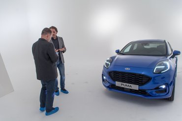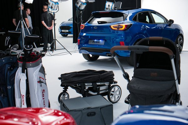 Maga az autó a nagy fehérség közepén ácsorgott szépen bevilágítva, de az ember elveszíti itt a tájékozódóképességét, és kicsit olyan volt az egész, mintha a tejszerű térben lebegett volna. A másik, függönnyel leválasztott stúdiófélben is állt egy Puma, de itt körbepakolták mindenféle tárgyakkal, amelyeknek az a dolguk, hogy beférjenek a Puma ötletes csomagtartójába – erről később.