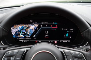 Még mindig utasként a nyugisabb részeken volt alkalmam tüzetesebben megvizsgálni a híresen minőségi Audi belteret. A vízszintes tagolású műszerfalra még a kissé bazári karbonberakással együtt is jó ránézni. A középkonzolon igazi gombokkal és tekerentyűkkel állítható a klíma, a drágább modelleknél ehhez egy kijelzőn kell tapicskolni. Úgy tűnik néha a szerényebb vevő is nyerhet a különböző árszintek erőltetett elkülönítésén. Viszont a központi kijelző pont olyan hatást kelt, mintha eleinte csak egy harmonikus belteret terveztek volna, és később jöttek rá, hogy nem maradt hely az elhagyhatatlan tabletnek.
