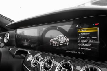 A baj csak az, hogy a gombok néha méltatlanul recsegnek, nincs meg bennük az a mercis finomság. Van viszont egy vakkapcsoló is, eleinte azt hittem, azért mert mégsem fullos autót kapunk 73 millióért, aztán egy kommentelő megsúgta, hogy ott lenne az állítható szárny gombja, de itt az ugye fix. Viszont a gomb helye maradt, hiszen így adja a ki a nyolc gomb a nyolc hengert V alakban. Analóg műszer szóba sem jöhet, Mercedes-módra két hatalmas tablet van, de már nem a tekerőtárcsás vezérlővel, hanem az MBUX tapipadjával. Ez csak azért baj, mert a fedélzeti rendszer viszont még a régi, és nem annyira szeretik egymást a tapipaddal, komolyan megnehezíti a használatot.
