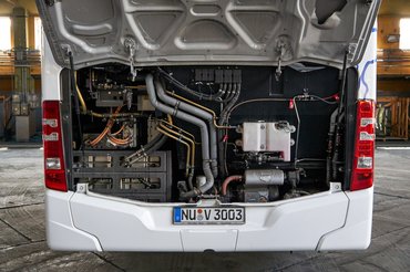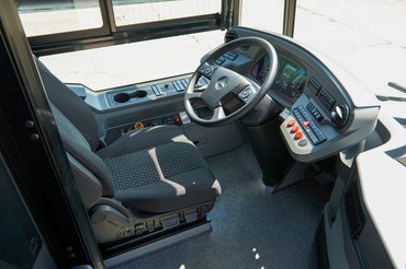 A látványos külső ugyan mást sugall, valójában nem alakították át a Citaro vázát. Csak azért különbözik kicsit az általunk megszokott buszoktól, mert az ilyen jószágokat mindig a megrendelő igényei szerint rendezik be, és ezt nem a BKK specifikálta. Az elektromos autóknál a padló alá igyekeznek az akkumulátorokat bezsúfolni, városi busznál ez nem jó, mert akkor hogyan lesz alacsony padlós? Ehelyett hátra, a 12 literes dízel helyére tettek négyet a busz akkumulátoraiból, melyek mindegyike 25 kWh energiát tárolhat. További kettőt, négyet, vagy hatot lehet a tetőre kérni, nagyjából oda, ahol a CNG-s változatok gáztartályai lennének, így lesz az összkapacitás 150, 200 vagy 250 kWh, a megrendelő igényei szerint.