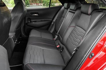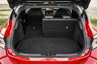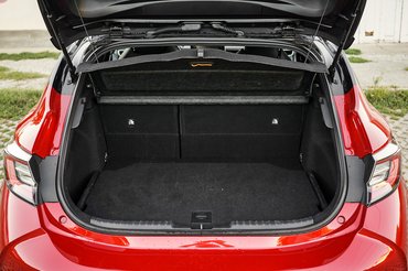 Bár az Auris nevet elengedte a Toyota, az ötajtós mégis érezhetően más célközönségnek szól, mint a szedán, vagy a kombi. Olyanoknak, akik legfeljebb kutyát vagy pár ittas barátot ültetnek hátra, de gyereket nem. Legalábbis ezt sugallja, hogy a testvérmodelleknél hat centivel rövidebb tengelytáv miatt szűk a hátsó hely, nagyjából mint a '90-es évek végén a békalámpás Corollában volt. Palacktartó helyett csak pohártartó van itt, de leginkább az fáj, hogy nem tűnik kényelmesnek az ülés. Legalábbis az én farokcsontomat nyomta a támla alsó, ledöntéskor is helyben maradó része. Ráadásul a hibridben a csomagtér csak 313 literes (alapváltozat: 361 l), ami szemre is szűknek tűnik, nemcsak az ellenfelek adataival összehasonlítva. A komoly, 1,4 kWh-ás akkumulátor ugyan az ülés alatt kapott helyet, a fedélzeti rendszerek 12 voltos akksija azonban nem fért el az orrban, hanem hátra került, emiatt emelt a csomagtérpadló.