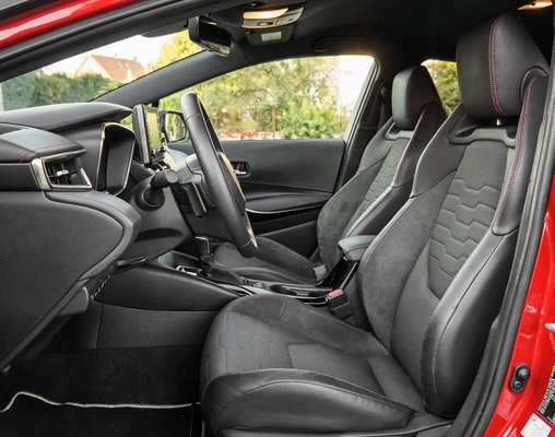A hibrid hajtáslánc tehát nagyobb kompromisszumot követel az ötajtóstól, mint a szedántól, pláne a kombitól, ami ugyanezzel a motorral kényelmesebb hátsó helyet és 581 literes rakteret ad. Ám mielőtt kiátkoznánk, a Toyota nem az egyetlen szűk ötajtós kompakt, a Peugeot 308 és a Mazda 3 is hasonló elvek mentén pozicionál. Van logika ebben a helyszűkében, hiszen családos ember manapság elvétve vetemedik alsó-közepes ferdehátú vásárlására. Miért tenné, amikor a kombi mindössze háromszázezerrel drágább, sőt a jól felszerelt tesztautóra kevesebb mint 10 százalékot kell rátenni, hogy meglegyen a hibrid RAV4. Tehát az ötajtós Corolla Hybrid Dynamic Force esetében a praktikum hiánya nem bug, hanem feature, pláne ebben a kényeztető Selection felszereltségben. Ez egy rakás extrát, látványos fényezést és sportüléseket ad a 180 lóerőhöz, ami jól hangzik, de így tízmillió kissé pazarlón elköltött forint a kocsi ára.