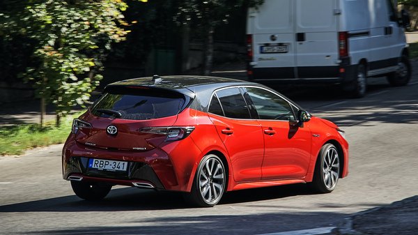 Hiába másfél tonnás Corolla, mégis remekül gyorsul, gyakorlatilag bármilyen helyzetből azonnal el tud lépni, és csak 140 km/h felett kezd kicsit fogyni a szusz. Van ugyan Sport és Eco kapcsoló, de annyira gyorsan reagál gázpedál útján közvetített utasításainkra a rendszer, hogy azokat teljesen felesleges nyomogatni. Az elektromotor pont annyit ad hozzá, hogy sose érezzünk torpanást vagy bizonytalanságot. A hátul is igényes futómű jó partner, magabiztosan mozog a Corolla, bár egyáltalán nem ráz az úthibákon, mégsem billeg, vagy himbálózik, ha kergetjük. Persze amikor éjjel kihalt országúton vadásztam vele a kanyarokat, akkor kiderült, hogy azért nem sportkocsi, különösen az érzéketlen kormány okoz kis bizonytalanságot, de a hétköznapi életben pont elég fickós. A nagy erő járulékos előnye az is, hogy korábbi Toyota hibridekkel szemben ennek nem kell pörgetés az autópálya-tempóhoz, tehát sokkal kevésbé tűnik erőlködésnek a nagy sebességű haladás.