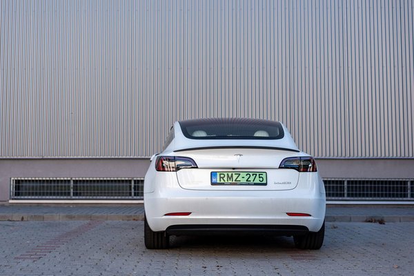 A hivatalos WLTP hatótáv 530 km. A valóságban nyugis autóúton, 90-100-as tempónál, jó időben ennyi. De városban, elővárosban 400-at simán elmegy biztosan. Nekem 450 km-t szokott mérni úgy, hogy az akku kímélése érdekében nem töltöttem 90% fölé a 74 kWh-s akksit. A Model 3 egyébként frissebb cellákból álló, korszerűbb felépítésű akkucsomagot kapott, mint a korábbi Teslák. A ceruzaelem-jellegű, de sokkal nagyobb, 21700-as cellákat a Panasonickal közösen gyártják, és önállóan építik össze akkutömbbé (mind a 4416 darabot). Ott van a sok tudomány.