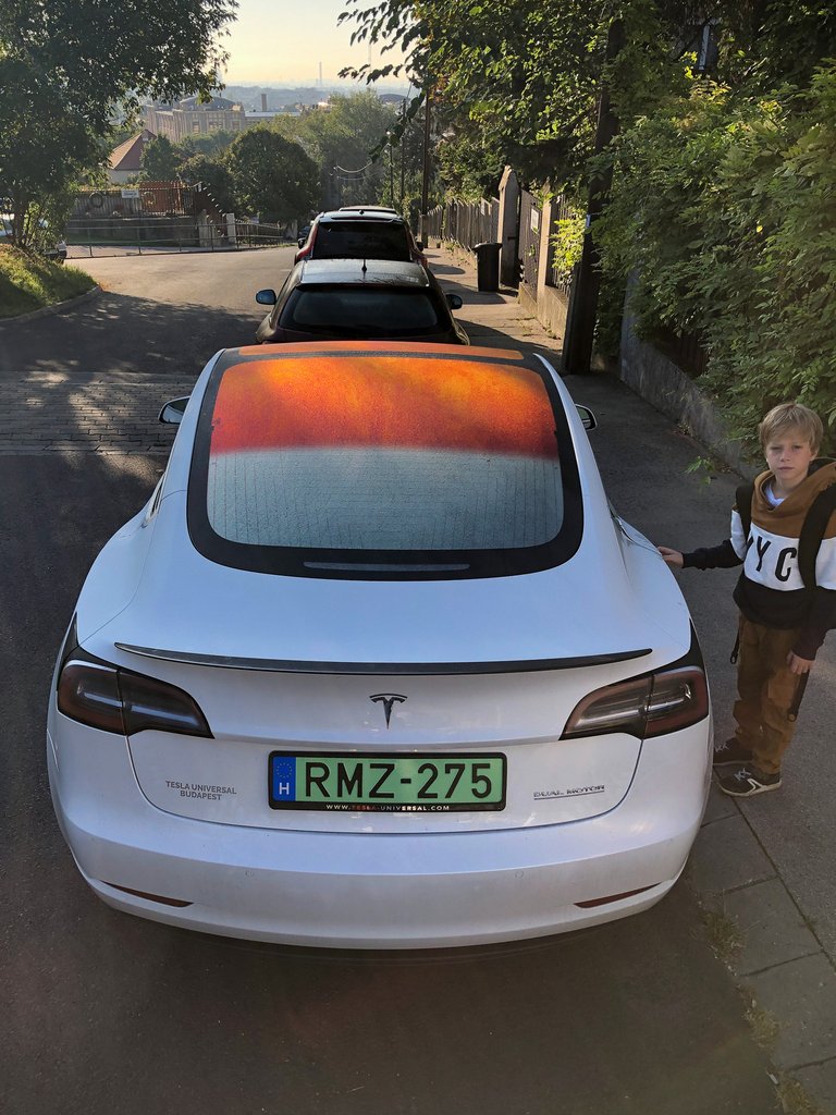 Nem csak az van, hogy jól törik a Tesla, hanem ménkü tágas is: 288 centi a tengelytávja, az néggyel több, mint a gigászi Skoda Superbé. Mivel az egész teteje üveg, még szellősebbnek is hat, mint amilyen. A B-oszloptól hátra egyetlen hajlított üveg ív a tető és a szélvédő, végtelenül hangulatos alatta üldögélni, ráadásul valami olyan szuperdurva hővédelem van a tetején, hogy (azon kívül, hogy egyáltalán nem meleg alatta ülni) szívbemarkolóan szépen vöröslik rajta a hajnal és az alkonyat fénye.