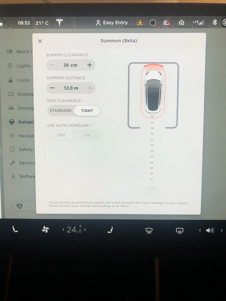 Remekül csinálta viszont a Summont: ez az, amikor az autó mellett állva ki-be áll nekünk a Tesla a szűk parkolóhelyről. Bár nem lehetünk tőle nagyon messze, és végig nyomni kell a telefonunkon egy gombot (hogy a mi felelősségünk legyen, ha megölünk valakit), mégis van valami egészen lenyűgöző abban, ahogy az üres autó egyszerre kijön elénk. Pláne, mert közben magától kikerül ezt-azt, ha útban van.