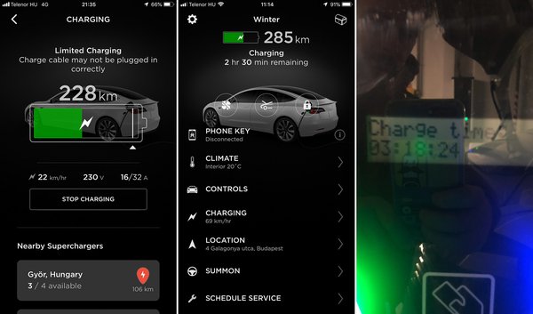 De. Mondjuk 20-30 perc alatt, 120 kW-tal töltve. Győrben. Az egyetlen helyen, ahol jelenleg van itthon működő Supercharger. De hamarosan lesz még pár, és amúgy sem vagyunk rájuk utalva: a Model 3 CCS-csatis, praktikusan minden itthoni nyilvános DC és AC-töltő viszi. Ez a hálózat pedig nagyon szépen bővül (azért van még hova), idén eddig pont megduplázódott. Az Ionity töltőkön a friss Model 3-ak 200 kW-ot is tudnak, az új Superchargereken 250 kW-ot fognak tudni. Ezek a számok tök érthetetlenek valakinek, aki nem villanyautózik, de a lényeg az, hogy a nagyon gyors töltőkön egy hotdog és egy kávé alatt simán felszed 300 km-nyi hatótávot a Model 3. Ide tartozik, hogy a fedélzeti elektronika (és a mindennél kiválóbb mobiltelefonos app) km/órában számolja a töltés sebességét, ami amennyire bizarr hülyeségnek hangzik elsőre, valójában annyira okos. Nem kell számolgatnunk, hogy hány amper, volt, watt és fázis, csak simán megmondja, hogy mennyivel tölt épp. Ha 326 km/h-val, amit például egy 50 kW-os DC-gyorstöltő tud, akkor egy óra alatt ennyit fog nőni a hatótávunk. Otthon, a konnektorból olyan 22 km/h-ban reménykedhetünk egy fázison (mármint ennyi jön a konnektorból).
