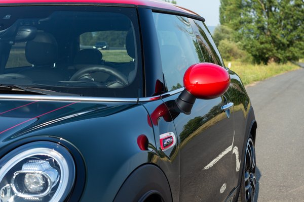 A tesztautóra valaki okosan nem konfigurálta rá a krómot, amivel általában meg szokták fojtani a fényszórókat és a hűtőrácsot. Na meg széttagolni az eleve kacifántos orrot. Itt színre fújt ívek vannak és sokkal letisztultabb így a képe. Még a John Cooper Works fantázianevű csíkokkal is a motorháztetőn, amik amúgy még egy JCW-n sem alapárasak. 50 ezer forintos extra, hogy ezt a két fekete-piros matricát felnyalják az orra, a Rebel Green fényezés pedig - amitől kevés fényben inkább fekete - 282 ezer forint. Ezt itt most csak azért írom, hogy majd ne legyen meglepetés a tesztautó ára, mert ilyen könnyű pillanatok alatt messze kerülni a háromajtós 8,8 milliós alapárától (a kabrió JCW 10,1-től indul). Az egész karaktert ügyesen felturbózó vörös tető és a vörös visszapillantó amúgy nem feláras.