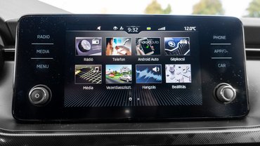Érdemes még néhány szó erejéig megemlíteni az infotainmentet, ami már alapból is 6,5"-es (Swing), az autóban viszont a középső méretű, 8"-es Bolero fantázianevű tablet volt (9"-esben már navi, valamint gesztus- és hangvezérlés is van). Mivel nincs túl sok funkció a kocsiban, így könnyű volt rendet tartani a menüben is, az érintésérzékenységgel sincsen semmi baj. Az már kicsit jobban zavart, hogy az Android Auto érezhetően sok volt neki, az egész rendszer belassult, nehézkessé vált az egyes lapok között a váltás. Gyakran előfordult vele az a hiba is, hogy a zenét lehetetlen volt felhangosítani, amikor pedig tekergetve próbálkoztam változtatni a helyzeten, egy pillanatra az egész rendszer befagyott.