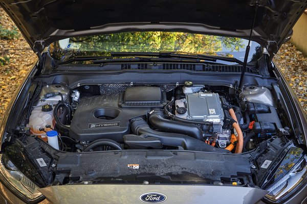 Bár még mindig újdonságként néznek sokan a hibridekre, a technológia már több, mint húsz éve az utcán van, és csak a Toyota több, mint tízmilliót adott el belőlük. Úgyhogy kezdi kiforrni magát a dolog, a Ford ráadásul nem gondolkodott sokat, egyszerűen megvette a japánok lincenszét. Tehát a Mondeo orrában nincs semmi meglepő, a jól ismert recept szerint egy kétliteres, Atkinson ciklusú benzinmotor dolgozik össze az 1,4 kWh-s lítium-ion akkumulátorból etetett villanymotorral. Hajszálpontosan úgy, mint mondjuk a Toyota Corollában, csak itt a rendszerteljesítmény picit még nagyobb, 187 lóerő. A Mondeo kombi 1,7 tonnás menetkész tömegét ez 9,4 másodperc alatt lendíti százra, a végsebesség pedig elfogadható 187 km/h.