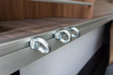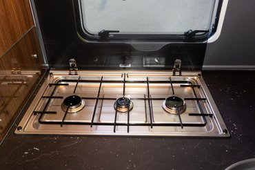 A konyha sem az eddig rendszerint látott mosogató/tűzhely kombó. A munkalapot egy finom ívvel befordították az utasülések mögé, és így már kényelmesen elfér külön a 3 állásos tűzhely és a mosogató. Nagy örömömre utóbbit egy rendes fa lappal lehetett lefedni, így, ha a kocsiban főznénk, jóval több helyünk van.
