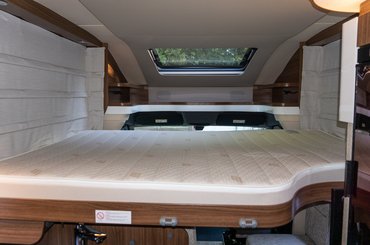 Mostanság ezek kezdenek kimenni a divatból, inkább a tesztautó megoldása kezd elterjedni, aminél az első ágy normál állapotban besimul a plafonba, alváshoz le lehet ereszteni. Ebben modellben elektromosan engedhető-emelhető ágy volt, amit egy kulccsal lehet biztosítani a nem szándékos leengedés (vagy a vicces barátok) ellen. Előnye, hogy nem kell akkora külső magasság, hátránya, hogy leeresztett állapotban némiképp megnehezíti a mozgást a fülkében, mivel az étkező részre ereszkedik.