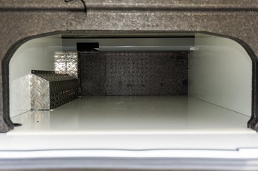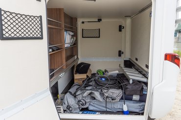 Az autó a fülkétől hátrafelé magával hordozta a korábban tesztelt full integrált modell előnyeit, mint például a dupla padlólemez. Ennek előnye télen jelentkezik igazán, hiszen minden cső, ami esetleg elfagyhat, már a fülke fűtött részében fut. A másik előny, hogy egy csomó extra tárolóhelyet nyerünk a kocsi aljában. Tárolóhellyel amúgy jól el vagyunk látva, mert a hátsó részben a garázs irtózatos befogadóképességű, akár 350 kg-ot elbír, és simán be lehet rakni egy robogót is.