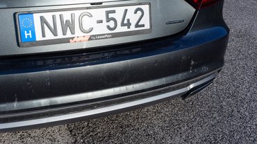 Száztízezer kilométere ellenére ez az A7-es kívülről azért kapott jó néhány parkolási sérülést. Az óriási, 21-es felniken és a hátsó lökhárítón látszik leginkább, a jobb oldali kipufogó is kicsit csálén áll, pedig még tolatókamera is van a kocsiban. Hogy törve volt-e, arról majd a Totálkár kártörténete mesél.