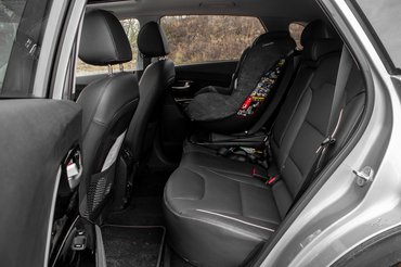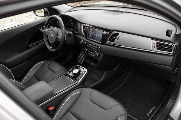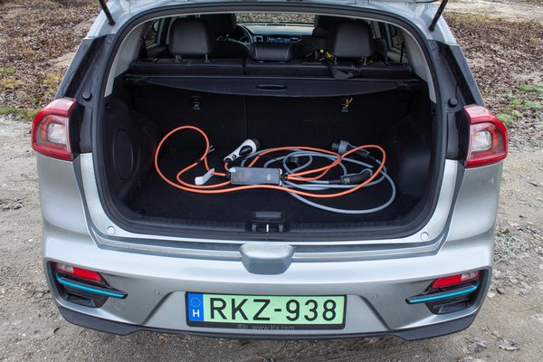 A teli hűtőmaszkból nyitható a töltőcsatlakozó. Már az első elektromos Soulnál is így volt, és mivel a nyilvános töltők nagy részénél a parkolóhely végében van a töltőoszlop, ez tűnik az egyik jó iránynak. A magas akkufeszültségnek (356 V a névleges) is hála elég bivaly tempóban tölthető egyenáramú gyorstöltőről. 50 kW-ossal 75 perc neki a lemerített akkut a kímélő 80 százalékig pakolni, de még bírja az annál erősebbet is. Szemben a kisebb akkucsomagos változattal, ami sehogy sem tud 45 kW-nál gyorsabban tölteni, ezzel megéri odaállni a 100 kW-os oszlophoz is, mert 70 kW-ig simán elszalad vele. Azaz egy órán belül meglehet neki a nyolcvan százalék. A váltóáramú fedélzeti töltés 7,2 kW-os, így falra is szerelhető töltődobozzal 9 és fél óra lehet nulláról teletölteni. Amúgy meg, ha nem kell az utcán hagynod esténként, az otthoni 230 voltos konnektorról sem értelmetlen töltögetni. Úgy 2,3 kW-tal folydogál bele a töltés, szóval egy este hatkor feldugott, reggel nyolckor leakasztott Niro 32 kWh-t szív be az állásban. Az meg papíron 230 kilométerre elég neki.
