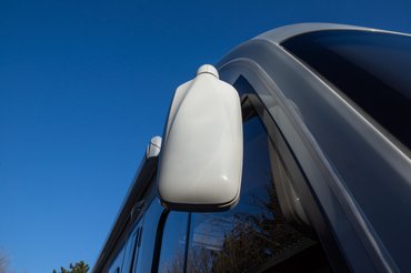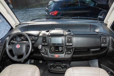 Ám mivel a bódét egy Fiat Ducato köré növesztették, így annak a műszerfala nézett ránk, beleértve a kihajtható irattartót is. Amiből, az oldalsó kart meghúzva kiugrik egy tablettartó adapter, így kényelmesen megoldódott a kérdés. A navit amúgy csak biztonsági okokból vittem magammal, nem tudtam, mi lesz a kocsiban. Az ismeretlen típusú beépített fejegység elsődleges célja (a rádión/pendrive lejátszáson kívül) a kamera képének megjelenítése volt. Ebből mindjárt hármat is találtam a kocsin. Van egy kombi kamera/fényszóró kombó a kocsi hátulján. Ez két nézőpontban működik, egyfelől klasszikus tolatókamera, másfelől alternatív, menet közben is kapcsolható visszapillantó tükörként is lehet használni, bár a kijelző fényereje lehetne valamivel izmosabb.