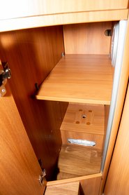 A hideg idő miatt sok ruhánk volt. A kabátoknak a fürdő külső oldalára raktak akasztókat, ez annyira nem volt praktikus a szűk helyen, így vagy az ülésekre raktuk, vagy a szélvédő mögé. Egyébként az autóban több, akasztós szekrény van, persze vállfával nem készültünk. Az autó abszolút téli üzemre készült, például az egyik ágy alatti tárolóban egy külön műanyag rekeszbe lehet a piszkos csizmákat betenni.