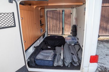 Az autó legnagyobb tárolója a hátul lakó gigantikus és fűthető garázs. Ez az erősített kivitelű volt, így itt már 450 kg a terhelhetősége, bár ekkor erősen feszegetnénk a 3,5 tonna határát, hiszen az autó menetkész tömege 2990 kg. Itt kapott helyet egy külön rekeszben a két gázpalack is.