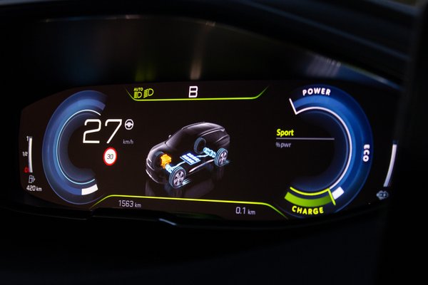 Szubjektív, hogy kinek a grandlandos egyszerűség, kinek ez a franciás csicsa jön be. Bent viszont elég egyértelmű a meccs: a dögunalom áll szemben a parádéval. Mennek az évek, de az i-cockpitnál még mindig nem tud senki jobbat a kategóriában, és szerencsére nem a hibridnél kapta el a Peugeot-t az átépíthetnék. Maradtak a vadászgépes/zongorabillenytűs kapcsolók, a fizikailag csak enyhén, optikailag nagyon a vezető felé fordított kezelőfelületek és az a kicsire nyomorgatott kormánykerék. És persze bejöttek új grafikák a digitális műszeregységre, amikkel lehet követni, hogy a három motor, az akkumulátor és a kerekek között ki merre tolja épp az energiát. Ez egyelőre kötelező, mert az alternatív hajtású autókat még mindig nagy számban veszik erre fogékony kockák, akik szeretnek ezzel buzulni. De ők legalább tényleg annak használják ezeket a plug-ineket, amik. Szóval töltik is, amikor lehet, mert csak úgy van értelme.