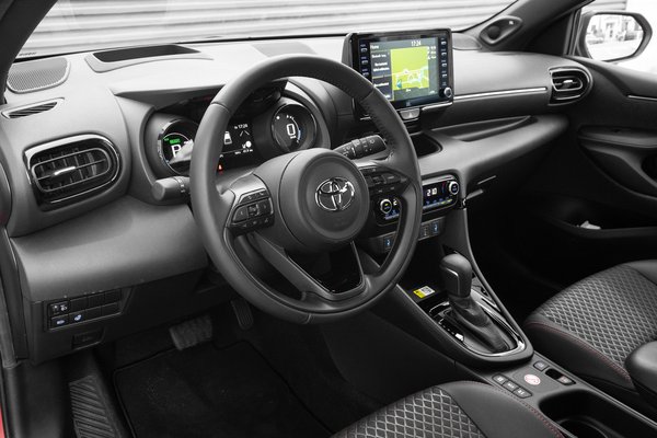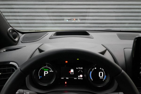 Az biztos, hogy az idősek kevésbé fogják szeretni, mert mélyebbre kell huppanni bele – ezt az ember azonnal észreveszi, amikor beül. A belső tér elég jópofa, az ajtókon filcborítás a díszítés, a műszeregység két csöve nem egy klasszikus szépség, mondjuk, de elég egyedi és némi megszokás után jól értelmezhető rajta minden, a szélvédőre pedig kifejezetten sok tartalmat, nagy felületen vetít a Yaris. Kár, hogy polarizált napszemüvegben nem látszik, pedig mi a francra vesz az ember polárszemüveget, ha nem vezetni? Ezt a Focusnál, a 3-as és CX–30-as Mazdánál már megoldották, csak szólok.
