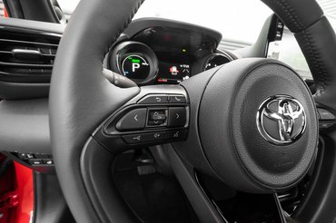 Kifelé araszolva a városból viszont már jó. Elég hamar elhallgat az ICE, alias Internal Combustion Engine, azaz a belsőégésű motor, onnantól villany szárnyán hajtunk és az autó beletalál a neki szánt szerepbe. Tűrhetően rugózik, jól ülök benne, a kisebbre szabott kormány megnyugtatóan nyugszik a kezemben. Minden finom, hiszen Toyota ez, a cég nem engedheti meg magának, hogy akár valós, akár képletes sorjákat hagyjon a rendszerben.