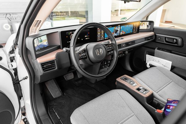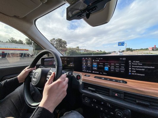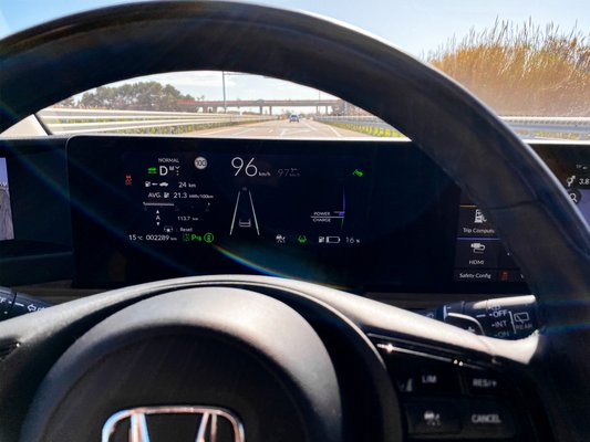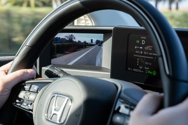 A vezetéshez szükséges kontrollok ugyanott vannak a kormányon, ahol a mai Hondákban szokás, így egy tempomat-bekapcsoláshoz, vagy a hagyományos fedélzeti komputer kattogtatásához se kell elengedni a fűthető karimát. Összességében az E-nél klasszikusabb felhasználói élményű villanyautót nehéz volna mutatni – ha nem lenne a hat (6) képernyőből három (3) a tükrök helyén.
