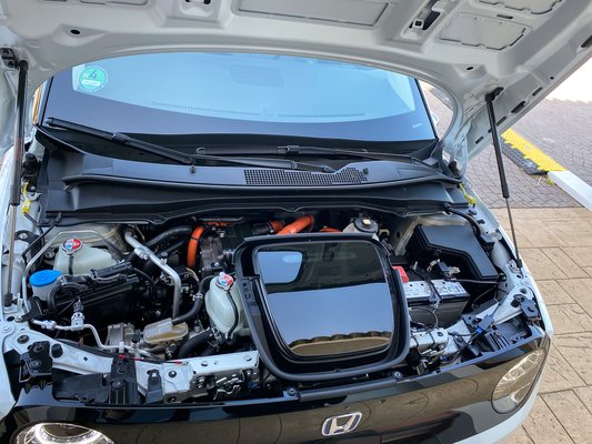 A klasszikus motorteret elöl sikeresen telerakták mindenféle hőcserélővel és segédberendezéssel, és innen vesz el helyet a töltőcsatlakozó is, szóval itt sincs csomagtartó. Összességében a valódi villanyplatformra épített elektromos autók között talán az E az eddigi legrosszabb helykihasználású, ami kétes dicsőség a mérnöki nagyszerűségért rajongó Honda részéről, enyhítő körülmény a forma, és hogy az utastér elöl tökéletes.