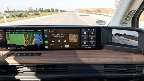 Mert elöl, ha még nem mondtam volna, tökéletes. Sík a padló, nincs a műszerfal alatt középkonzol, nagyok az ablakok (és a tetőn is van egy), plusz a képernyők alatti fapolc is ad egy csomó teret még. Furcsa módon azt is meg lehet szokni, hogy egy hattermes multiplex összes filmjét nézzük egyszerre, és a matt képernyők nem csillognak és nem vakítanak (legalábbis nappal). Ami jó, hogy megy a vezeték nélküli CarPlay és Android Auto is, szóval a telefonon még mindig messze kiforrottabb alkalmzásainkat nem veszítjük el, de például magát a telefont nincs hova rendesen lerakni, pláne nem egy szem előtt lévő indukciós töltőre, mint bizonyos más, erre a vevőrétegre lövő autóban.