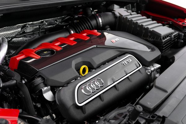 Ráindítok, felugat, és okosan csillapított motortartóbak ide, szigetelt kaszni oda, a rezgéseken is érezni, hogy az öthenger az más. Az robban. 26 kilót faragtak az előző sorötöshöz képest, 400 lóerőre és 480 newtonméterre vagyunk jók, ezzel falat lehetne bontani, és valószínűleg lehet is, ha elsokalljuk. Kilencszer választották meg az év motorjának, alu a forgattyúsház, üreges a főtengely, a vízpumpa terheléstől függően változtathatja a szállítókapacitást... sorolják, sorolják, mi meg szédülünk bele. 2019-ben kétmillió motor készült Győrben, ebből alig 15 ezer volt öthengeres TFSI.
