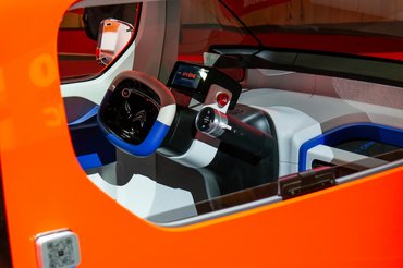 Az utastér, ha lehet, még messzebb került a tanulmánytól. Az ajtók nyitására primkó hevederek vannak belül, kívül meg az ujjtöréshez is elég erővel nyomandó gombok, mint egy Wartburg csomagtartójánál. A belső anyagminőség olyan, mintha slaggal tisztíthatóra tervezték volna, ami egy autómegosztásra is szánt modellnél reális szempont. Van pár színes, kivehető tároló modul a műszerfal tetején, egy mobiltartó a kormány mellett, tárolóháló az ajtókon – és ennyi, még jó, hogy a mobil elemek színe megválasztható. Az az utast valamennyivel hátrébb ültették a vezetőhöz képest, mint valami ralinavigátort, hogy vállban jobban elférjenek egymás mellett. Letekerhető ablak nincs, csak felfelé nyíló üvegszelvény, mint a Citroën Kacsa ablakainál.