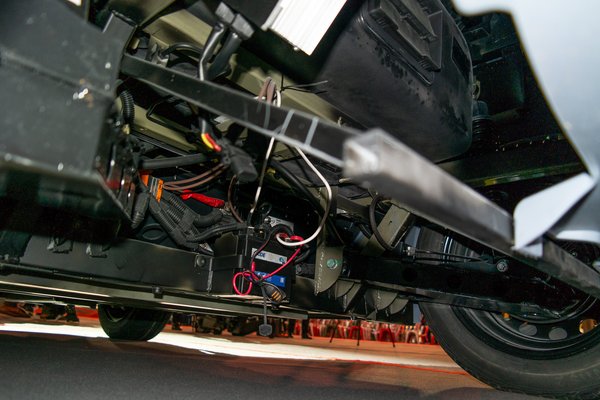 Nem bírtam megállni, hogy ne nézzek a mindössze 2,41 méteres, 485 kilós kis gép alá. Pont azt láttam, amire számítottam: fém vázra kerültek a műanyag burkolatok, a nagy hagyományokkal rendelkező francia mopedautózás ezt az elvet használja ezer éve. Az ajtók nem csukódtak valami pontosan, nagyjából úgy kell bevágni őket, mint a budiajtót. A prototípusok vázán reszketeg hegesztési varratok láthatók, azt nem tudnám megmondani, milyen anyagból készültek – egyes mopedautóknál ez alumínium, de az Amié inkább tűnt sima acél zárt szelvénynek. Véletlenül valaki elindította az ablakmosót, az egyetlen ablaktörlő szomorúan csapkodott a hatalmas szélvédőn. Viszont cserébe 7,2 méter átmérőjű körön megfordul a kis gép.