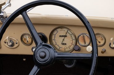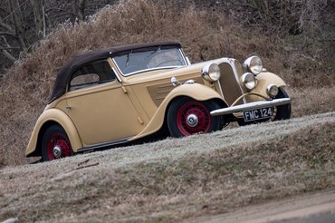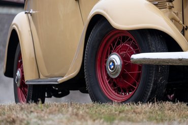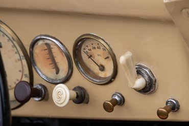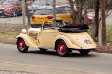 Mert ez itt kerek, íves, hangulatos, kívülről szinte rajzfilmbe illően cukorfalat. Kávészín számlapos műszerei, fehér gombjai vannak (azaz párat közülük sajnos már fémfogantyúsokkal pótoltak), finom kis krómozás fut rajta itt-ott, de ezt sehol nem túlozták el. Tökéletesek az arányai: hosszú orr, áramvonalas sárhányók, rövid far, kádszerű utastér, markáns tető. De ilyen színkombinációt (krém a piros kerekekkel) szerintem csak Angliába rendeltek belőle, mert az összkép nagyon nem német.