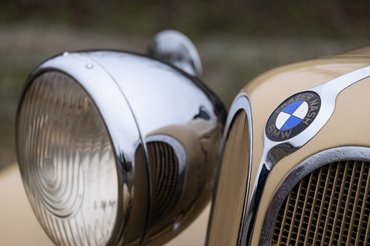 A három Bosch-fényszóró – a középső ködlámpa, mert akkor még engedték az ilyet – úgy tökéletes, ahogy a tojás is. A maszk természetesen két hatalmas veseforma (ide akar visszanyúlni manapság a BMW, csak hát, ami működött nyolcvan-kilencven évvel ezelőtt, azokon a keskeny és hosszú géptetőkön, az kevésbé ügyes ma), a felső két ív között pedig régi, talpas tipográfiás BMW-logó lakik, a német rövidítés előtt a Frazer Nash szavakkal.