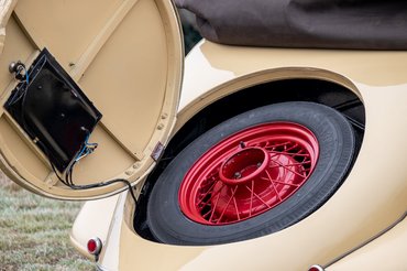 És akkor a hátulján ott vannak a Csepel Velence kerékpáréval tökéletesen megegyező, gyémántok mintájára csiszolt üveg macskaszemek. Az áramvonalas, alumínium zsanéros fedelet kinyitni felhúzókulcsnak is beillő, szárnyas kulccsal lehet, alatta a teljes rakteret kitöltő, piros, küllős pótkerék lakik. Gyönyörű minden porcikája.