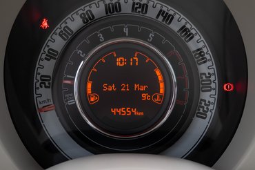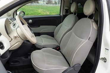 A beltérben minden számítás szerint nem szabad még komoly használati nyomoknak felbukkanni ennyi kilométerrel. A kéttónusú belső, a nagy, fényes, világos betét a műszerfalon, a kockás üléskárpit és a csodás, kerek, kívül kilométerórás, belül fordulatszámmérős, középen digitális kijelzős műszeregység mind-mind hozzájárulnak a vidám retróhangulathoz, és valóban nem látszik sehol számottevő kopás. Egyedül a kormány kezdett bebarnulni, ilyen színnél ez elkerülhetetlen, hacsak nem fehér kesztyűben vezetünk le minden kilométert. Amúgy összességében jól kitalált autóbelső a kis Fiaté, egyedül a nagy bumszli ablakemelőgombok tájidegenek. A prémiumság itt nem a felhasznált anyagok minőségében, hanem az ötletekben és a stílusban rejlik.
