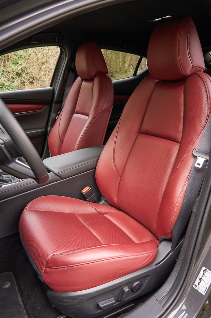 Az már fotókon nézegetve nyilvánvaló, hogy teljesen bunkerszerű a hangulat odabent. Annyira kicsik a hátsó ablakok, hogy amikor beültettem a családot, tini lányom röhögve mémesítette: Is this a window? A vicc azonban nem ez, hanem hogy a látvány csalóka. A Mazda 3 tágasabb, mint bárki gondolná, simán elfértünk, még a középső hely is panaszmentes volt. Persze süldő gyerekekkel könnyű, felnőttből négynél többet ne álmodjunk bele, a csomagtér 327 literje meg csak két főre elég, ha többéjszakás az út. Finoman erre utalt a Mazda, amikor a hátsó térből az elektromos csatlakozókat és a szellőzőrostélyokat kihagyta, viszont a feláras Bose hangrendszer ott is remekül szól. Amiben pedig mind az öten egyetértettünk, hogy hiába ráz egy kicsit jobban, mint ideális volna, a szenzációs ülések ezt feledtetik.