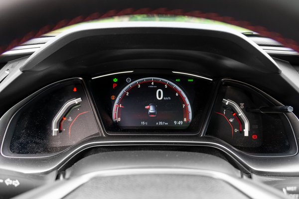 Az Executive Sport Line felszereltséghez jár a Honda Sensing biztonsági csomag, amiben van sávtartó, táblafelismerő, elöl és hátul is figyelő automatikus vészfék és radaros adaptív tempomat. A rendszerek nálam megkapnák a hármas alát, de például a radaros tempomat még a legkisebbre állított követési távolságnál is éppen egy fokkal hamarabb kezd el fékezni, mint szeretném. A sávtartó tényleg csak makulátlan felfestéseket ismer, de akkor legalább viszonylag enyhe a pingpong-effektus, a Civic egész jól betalál a sáv közepére. A sáv felismerését mutató piktogram viszont nem elég informatív, nehéz meggyőződni, hogy az autó vajon tényleg látja-e a sávokat, vagy sem. Az utolsó előtti nap egy parkolási manővernél aztán becsúszott egy fals vészfékezés is, ami miatt már nem biztos, hogy jó szívvel írnám be a hármast a naplóba.