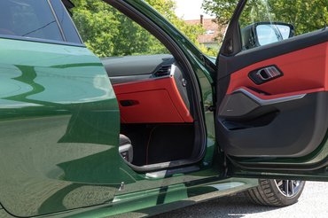 Ami viszont teljesen ellopja a showt, az a szín. Ez az autó zöld, BMW-nyelven Verde Ermes. Amíg csak képen láttam, nem éreztem a húzását, F Astrából is volt ilyen árnyalat. Viszont élőben nagyon súlyos látvány, mert maga a szín sem rossz, de a benne lévő szemcsék csillogása miatt különösen megragadó. Meg persze a szokatlanság is sokat számít, hogy egy BMW-n jellemzően már a sötétkék is olyan merész árnyalatnak számít, hogy a rendelésnél visszakérdeznek az illetékesek, így a zöld különösen ütős. Amikor Sándor, a BMW munkatársa átadta az autót, azt mondta, lehet ez most egy kicsit erősre sikerült, de nem, ez így tökéletes, főleg, amikor kinyitják az ajtót és világít a piros bél. Nekem tényleg csak egy kombi kasznival lehetne emelni látványt, esetleg egy kizárólag hátsókerekes hajtással, de utóbbit csak Amerika kapja meg az M340i-ből, itthon marad a kötelező xDrive az erős motor mellé.