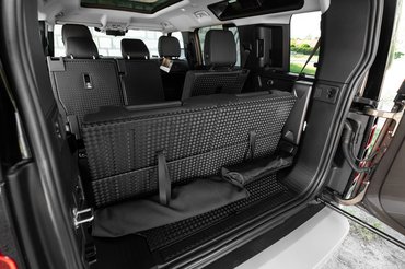 Kicsi a fordulókör, a kormány lassú tempónál könnyű, hatalmasak a tükrök és van 360 fokos kameránk, ezért hiába óriási s doboz, ha van valahol egy defendernyi hely, az autót karcmentesen bele tudjuk tenni. Legfeljebb majd kiszállni nem tudunk, de arra meg ott a villanyos tolótető és a taposólemez a gépháztetőn, lehet akrobatizálni. Vallomással tartozom: csak az autó visszaadása után jöttem rá, hogy a First Edition-kivitel belső tükre is képes kijelzőként funkcionálni. Hogy ez mire jó? Ha valaki tetőig rakja a csomagtartót elejtett vaddal és vadászkutyával (hogy most utóbbi is elejtett-e vagy sem, nem tartozik szorosan a teszt vizsgálódási körébe), akkor is kristálytiszta képet láthat arról, mi van a kocsi mögött.