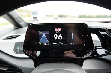 Ami még baromi jó ötlet: letakarították a műszeregységről a felesleget. Egy pici LCD van a kormányoszlopon, ezzel együtt is mozog, ahogy a kormányt állítod. Három részre osztották a képernyőt – balra az asszisztensek kijelzése (sávtartó, követésitávolság-tartó, stb.), középen a sebesség, jobbra meg a navi egyszerűsített kijelzése. Ebből a két szélső lehagyható, akkor a maradék kettő nagyobb kijelzésű. Persze van még alul egy csík a töltés, energiafelhasználás ábrázolására, de a hülye és értelmetlen animációktól (energiaáramlás és társai) megkímélték az ID.3 felhasználóit. És persze akad még pár apró kijelzés, a hatótávé, a sebességhatároké, amiket Németországban elég jól ismer fel a kocsi, sőt, a tempomat automatikusan alkalmazkodik is ezekhez. És még az autópálya feletti, kijelzős korlátozásokat is felismeri. Illetve időben figyelmeztet, hogy falu jön, vedd el a gázt.
