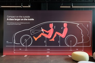 A beszállásnál már érezni, hogy itt még sem stimmel valami: mintha egy ős-A osztályba szállnánk, hiába alacsony a kocsi hasa, nagyon magasra kell belépni: itt az akkucsomag az ok. A hátulra rakott motor miatt az első kerekeket egészen előretolhatták, így jött ki a a középkategóriás limuzinokat megszégyenítő 2,76 méteres tengelytáv. A volkswagenesek a Passat kombihoz hasonlították a belső méreteit, én inkább a Golf Plus/Sportsvant érzem hasonlónak.