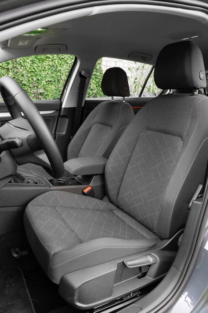Hely elöl is van bőven, és a márka hagyományaihoz híven tág határok között állítható a kormány meg az ülés, bárki el tud helyezkedni. Beülve döbbenten tapasztaltam, mennyire kényelmes a vezetőülés, aztán napokig sehogy sem találtam a tökéletes beállítást, de ez nem az ülés hibája, inkább a térdeim és a pedálok nem viszonyultak jól egymáshoz. Csak az autó visszavitele után esett le, hogy ez mekkora újdonság, a VW tesztautókban mindig panaszkodni szoktam, milyen kemény az ülés, ez viszont nem. Szépen megtámaszt és van oldaltartása, mégis szinte puha a tömése, még a kárpit tapintása is kellemes. Nagyon eltalálták, amiben az a különösen szép, hogy ez is széria, úgyhogy aki céges- vagy bérautóként az itthon belépőszintnek számító Life-ot kapja, nem fogja magát becsapva érezni.